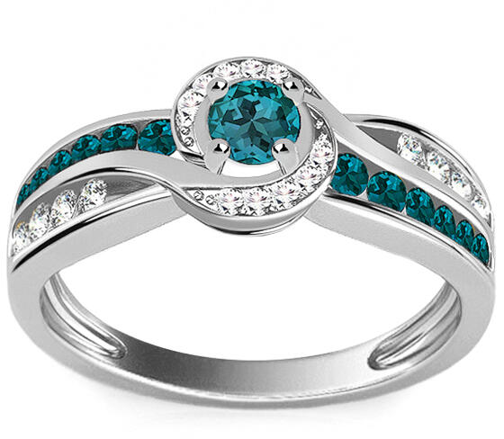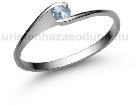 Praktikus viselésű eljegyzési gyűrű, csavart foglalattal, akvamarin kővel a közepén.