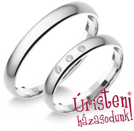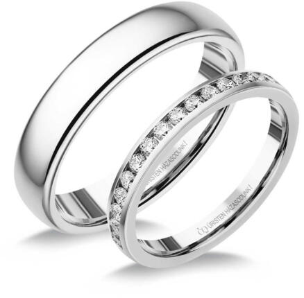 Hagyományos, 4.5 mm széles, fehér arany karikagyűrű. A női gyűrű gyémánt kövekkel ékített.