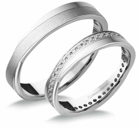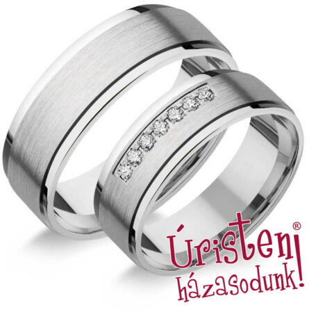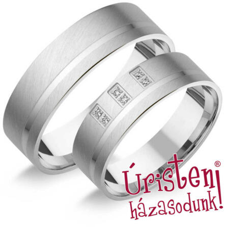 Modern, fehér arany karikagyűrű, 6 mm széles sínnel, fényes és matt felülettel. A női gyűrű 6 gyémánt kővel ékített.