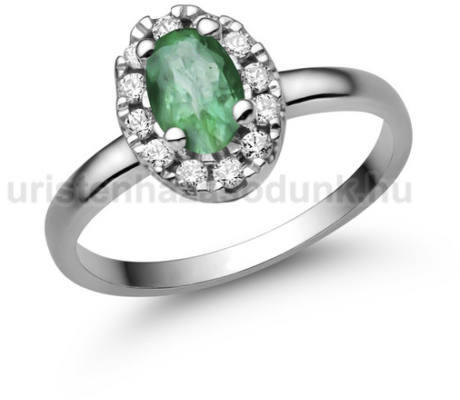 Különleges eljegyzési gyűrű, ovális nagy smaragd kővel és több kisebb cirkónia kővel.