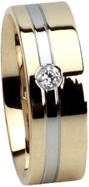 Sárga arany, klasszikus karikagyűrű. Vékony, 1.4 mm széles sínnel, a női gyűrű gyémánt kövekkel ékítve.