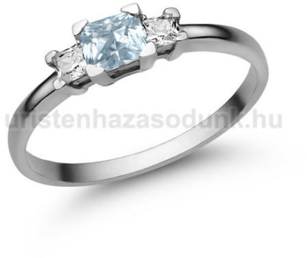 Modern, 3 köves eljegyzési gyűrű, szögletes akvamarin kővel és 1-1 cirkónia kővel odlalt.