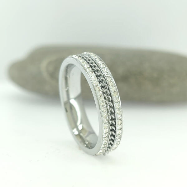 Ezüstszínű nemesacél ( 316L ) gyűrű, melyet csillogó fehér cirkónia kristályok díszítenek. A kristályok a gyűrű két szélén helyezkednek el, a közepén áttört minta húzódik végig. A kristályok ragasztott foglalatban helyezkednek el. Időtálló darab, nem feketedik, mindennapi viseletre is alkalmas. Antiallergén ékszer. Gyűrű szélessége: 5 mm. A nemesacél ékszerek r