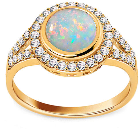 Elegáns és egyedi gyűrű, melyben egy kerek fehér opál kő dominál, egy egyszerű arany rámában, csillogó, tiszta cirkóniákkal díszítve. Az ékszer felületének fénye magas. Válasszon egy gyűrűméretet a rendelkezésre álló méretek közül.