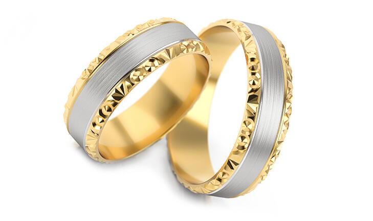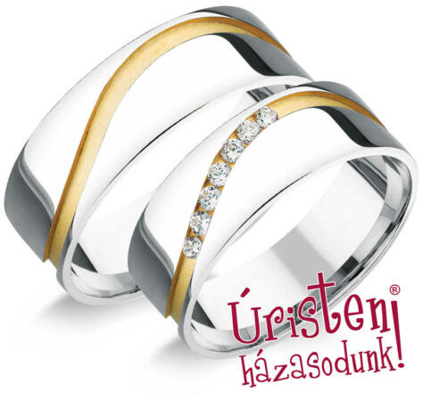 Kombinált, 14 karátos aranyból készült jegygyűrűk, lapos profillal, a Soul kollekcióból. Ezek a 5 - 7 mm széles karikagyűrűk belső lekerekített profillal rendelkeznek, a nagyobb kényelem érdekében. A gyűrűk központi díszét egy dombornyomott vonal alkotja fehér aranyban, ahol a sárga arany peremvonalakat magasfokúan polírozott, gyönyörű gravírozás díszíti. Amennyibe