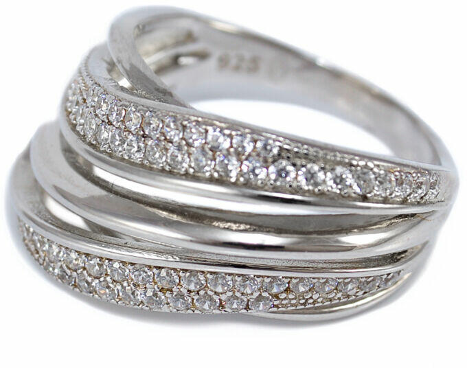 Modern stílusú, hullámos mintájú, apró cirkónia kövekkel ékített, ródiummal bevont masszív kialakítású ezüst gyűrű.