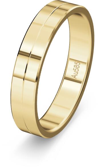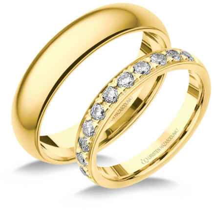 Hagyományos, sárga arany karikagyűrű, fényes felülettel, kívül-belül domorú profillal. A női gyűrű cirkónia kövekkel díszített.
