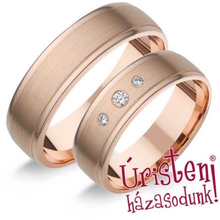 Széles, rozé arany karikagyűrű, fényes és matt felülettel, 3 gyémánt kővel ékítve.