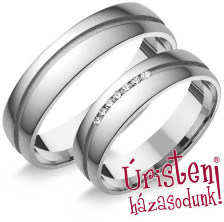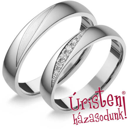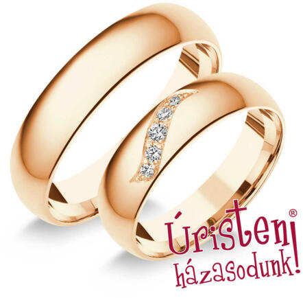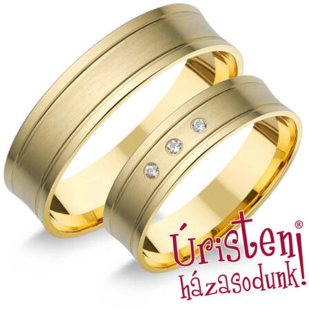 Modern, sárga arany karikagyűrű fényes és matt felülettel, enyhén domború külső-belső profillal, vésésekkel. A női gyűrűt 3 gyémánt kő ékíti.