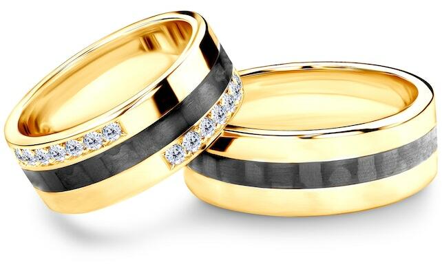 Esküvői karikagyűrűk: karbon és arany, lapos, 7,5 mm