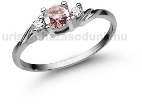 Csavart fazonú eljegyzési gyűrű rózsaszín zafír kővel középen és 1-1 gyémánt kővel oldalt.