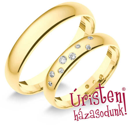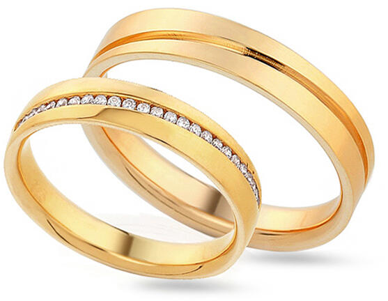 Sárga, tizennégy karátos aranyból készült, exkluzív jegygyűrűk. Szélességük 4 mm, belső profiljuk lekerekített a nagyobb kényelem érdekében. A női gyűrű dísze egy átlós vonal, amely összesen huszonöt, kiválóan foglalatba helyezett, csillogó gyémántból áll, melyek összsúlya 0,120 ct, színe H és tisztasága SI1. A férfi gyűrűt egy elegáns barázda díszíti k
