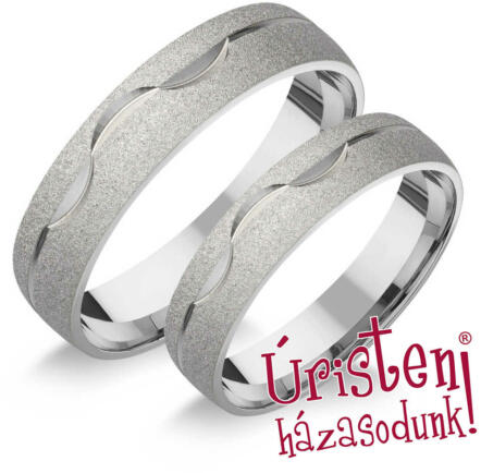 Különleges, csiszolt felületű, fehér arany karikagyűrű, körbe fényes vésésekkel.
