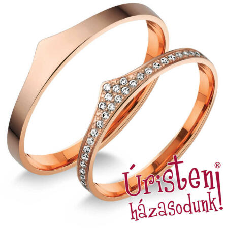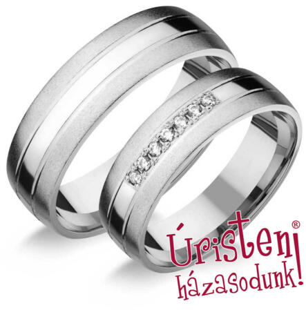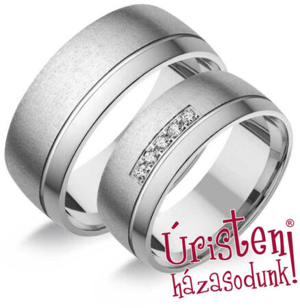 Széles, fehér arany karikagyűrű, 8 mm-es sínnel, enyhén domború külső és belső profillal. A női gyűrű 5 cirkónia kővel díszített.