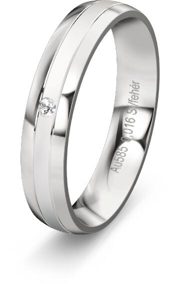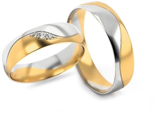 Jegygyűrű tarka, 14 karátos aranyból, gyémántokkal. Ezeknek az 5 mm széles karikáknak belső lekerekített profiljuk van a nagyobb kényelem érdekében. A gyűrűk központi díszítése egy hullámos vonal, amely sárga és fehérarany 2 felére osztja őket, nagy polírozással. A női gyűrűt három gyémánt díszíti. A nagyobbik 0,020 ct, a két kisebb pedig 0,010 ct. Válassza ki