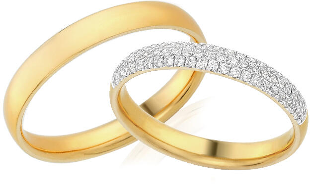 A gyűrűk sárga, aranyból készültek, félkör alakú profilral. Ezeknek a 3,6 mm széles karikáknak belső lekerekített profiljuk van a nagyobb viselési kényelem érdekében. A női gyűrű központi dísze három sor jól illeszkedő, összesen hatvanhét gyémánt, össztömege 0,330 ct, H színe és átlátszósága SI1. A karikák felületi kezelése magas fényű. Válassza ki a gyű
