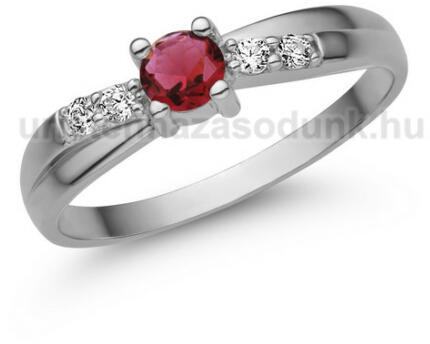 Csavart stílusú eljegyzési gyűrű, modern csiszolású rubin kővel és 2-2 darab cirkónia kővel oldalt.