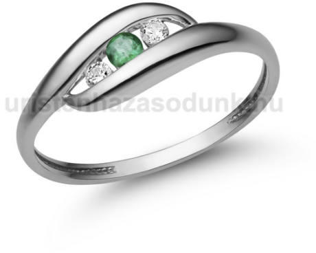 Csavart fazonú eljegyzési gyűrű, 3 darab smaragd kővel és cirkónia kövekkel, fehér arany foglalatban.