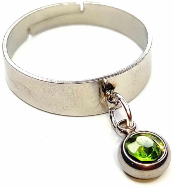Zöld kristály charmos állítható méretű rozsdamentes acél gyűrű, ezüst színű, választható szélességben. Paraméterek: Charm mérete 0,6 cm. Anyaga fémötvözet és kristály, gyűrű anyaga rozsdamentes acél. A keskenyebb gyűrű lekerekített fazon. Szélesebb gyűrű 5 mm, keskenyebb 4 mm, választható. Ha nem választasz szélességet, mindig a képen látható gyűrűt küld