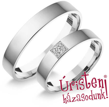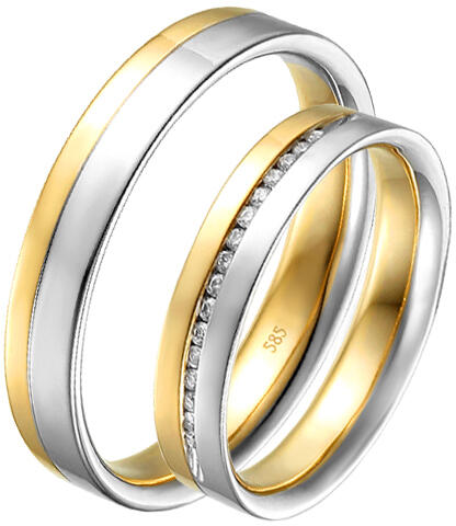 Az Ön esküvője napjára tökéletesek ezek a kombinált, tizennégy karátos aranyból készült, exkluzív jegygyűrűk, lapos profillal. A karikagyűrűk szélessége 4 mm, belső profiljuk lekerekített a nagyobb kényelem érdekében. Az arany felületi kezelése magasfényű. A női gyűrű dísze tizenhat kiválóan foglalatba helyezett, csillogó gyémántból álló vonal, a kövek öss