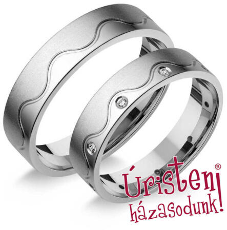 Modern, fehér arany karikagyűrű, hullámos véséssel. A női gyűrű 5 cirkónia kővel díszített.
