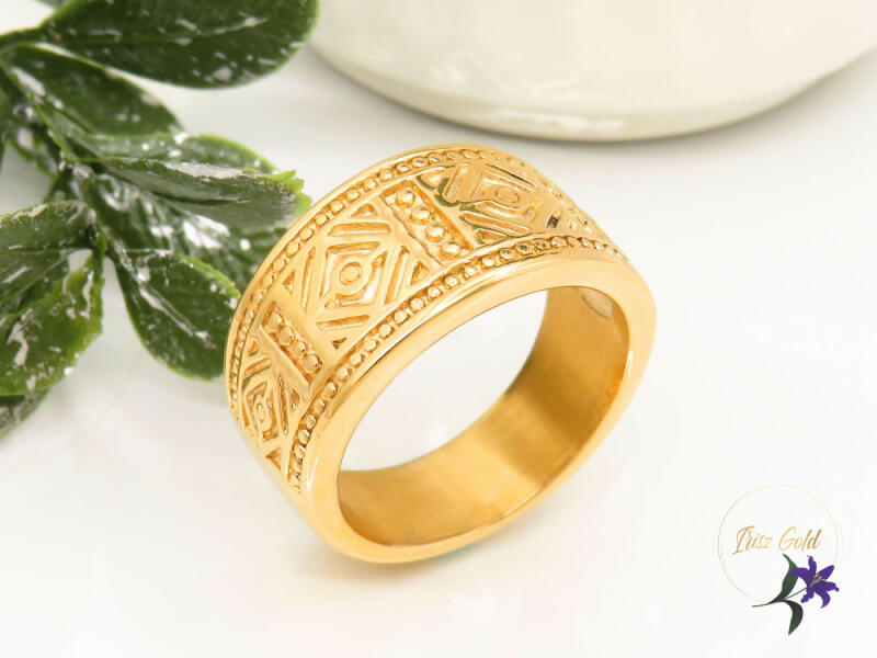 Antiallergén nemesacél metszett díszítésű széles gyűrű Szin: 18K Szélessége: 12x11x2mm A forgalmazott divatékszerek alapanyaga nikkel és ólommentes ezért többnyire nem okoznak allergiás tüneteket, nyugodtan hordhatják fémérzékeny emberek is. Általában nem színezik a bőrt és más divatékszerekhez képest nagyságrendekkel jobb kopásállósággal rendelkeznek. A fehér (