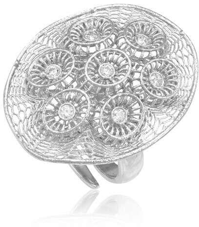 Néhány gondolat Szemet káprásztató részletek; az áttört felület leheletkönnyű, mégis zsongó látványa ámulatba ejtő. A hét kis kő apró csillagképet alkotva beragyogja ezt az alkotást. Utánozhatatlanul egyedi, műgonddal kidolgozott gyűrű, elegáns, ezüst színben. Részletek Áttört ezüst ékszer Állítható méretben A gyűrű fejének mérete: 20 x 30 mm