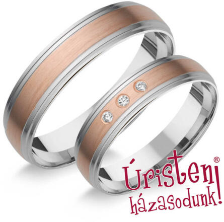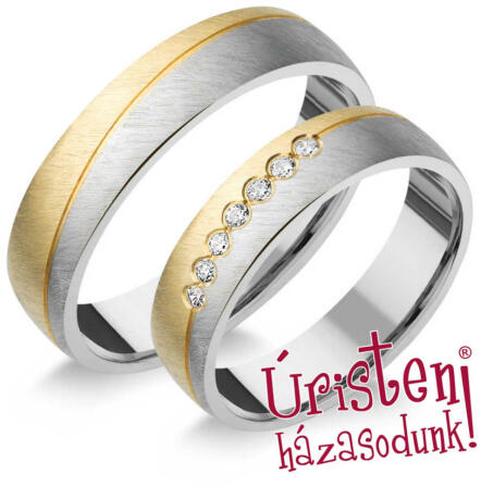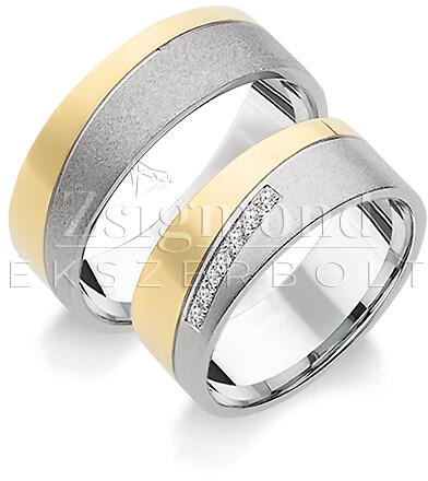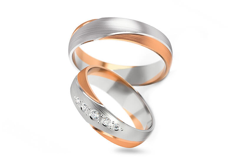 Egyszerű és megismételhetetlen megjelenés, amelyet megsokszoroz a cirkonok ragyogása. Kétszínű, aranyból készült, 5 mm széles jegygyűrűk, lekerekített profillal. A dísz egy fehér arany vonal, amely átlósan halad át a gyűrűn, s ellentétet alkot a sárga arannyal, ahol a női változatot öt darab cirkon egészíti ki. Az arany felületi kezelése dombornyomott. A gyűrűk bel