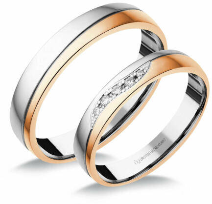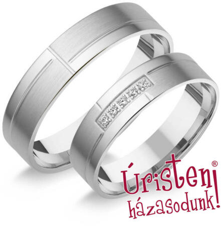 Modern, fehér arany karikagyűrű, matt és fényes felületekkel, szimmetrikus vésésekkel. A női gyűrű 5 gyémánt kővel ékített.