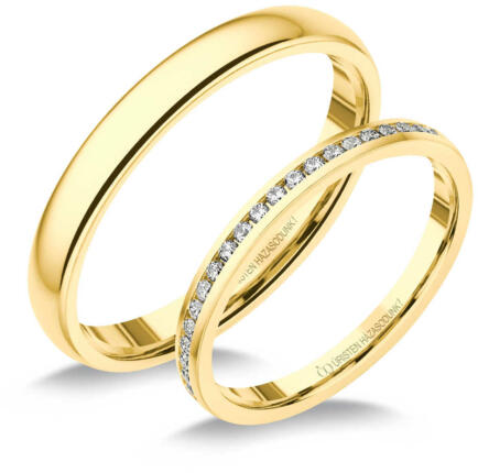 Vékony, klasszikus, sárga arany karikagyűrű, fényes felülettel. Kívül-belül domború, kényelmes viselet. A női gyűrű cirkónia kövekkel díszített.