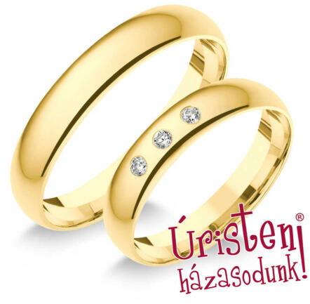 Klasszikus, sárga arany karikagyűrű. Kézzel készített, kívül-belül domború profillal, 3 gyémánt kővel ékítve.
