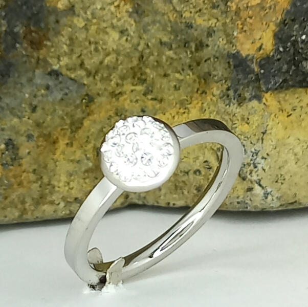 Ezüstszínű nemesacél ( 316L ) gyűrű csillogó, fehér cirkónia kristály díszítéssel. A kristályok ragasztott foglalatban helyezkednek el. Időtálló darab, nem feketedik, mindennapi viseletre is alkalmas. Antiallergén ékszer. Gyűrű szélessége: 2 mm. Kristályos dísz átmérője: 8 mm. A nemesacél ékszerek rendkívül népszerűek kedvező tulajdonságaik miatt. A nemesacél s