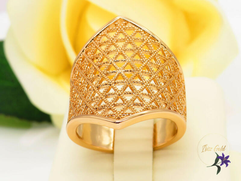 Gold filled hosszú fazonú háló mintás gyűrű Szin: 18K Méret: legszélesebb 25x6mm A forgalmazott divatékszerek alapanyaga nikkel és ólommentes ezért többnyire nem okoznak allergiás tüneteket, nyugodtan hordhatják fémérzékeny emberek is. Általában nem színezik a bőrt és más divatékszerekhez képest nagyságrendekkel jobb kopásállósággal rendelkeznek. A fehér (ezüst)