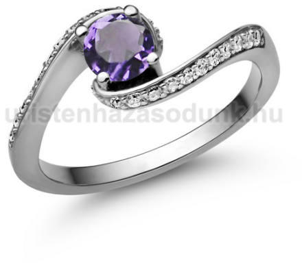 Extravagáns eljegyzési gyűrű, lila ametiszt kővel a középpontban, további 22 darab cirkónia kővel oldalt.