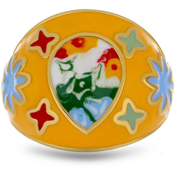 Arannyal Bevont Ezüst Gyűrű Tűzzománccal, súlya kb. : 8.9 gramm KÓD: Y52708 Ékszer mérete: 20.85 mm x 25.15 mm Minden drágaköves ékszerünk eredetiséget igazoló tanúsítvánnyal érkezik, ami igazolja az ékszer nemesfém eredetiségét, és az ékszerben lévő drágakő karátszámát. Ezüst és arany ékszereink nemesfém jelzéssel, finomságjelzéssel és névjelzéssel vannak