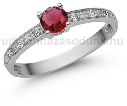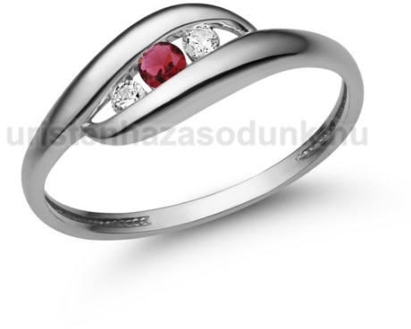 Finom, elegáns, 3 köves eljegyzési gyűrű, csavart, fehér arany foglalatban rubin kővel és gyémánt kövekkel.