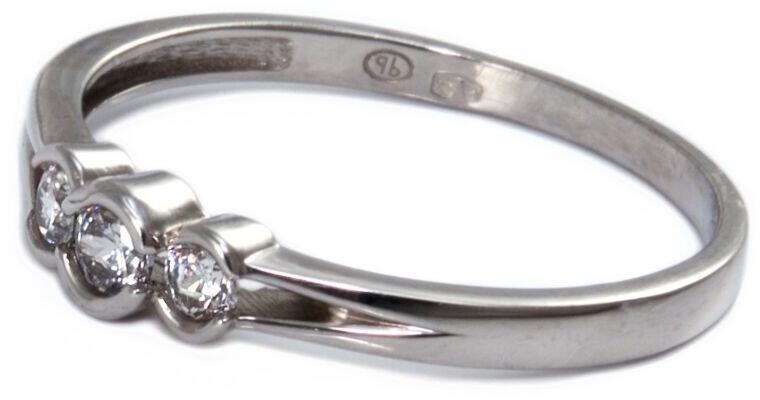Modern stílusú, egyszerűen elegáns, ez a fejrészén 3 cirkónia kővel ékített, ródiummal bevont arany eljegyzési gyűrű.