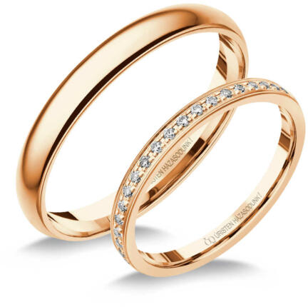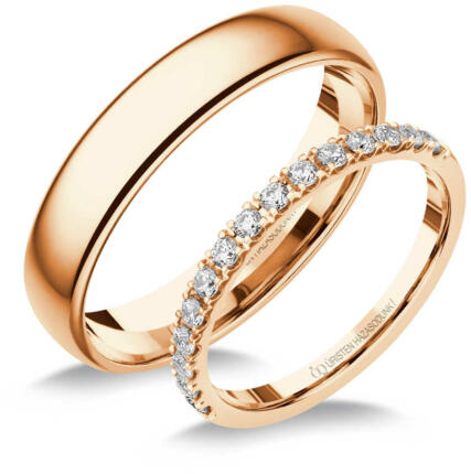 Vékony, fényes felületű karikagyűrű rozé aranyból. A női gyűrű gyémánt kövekkel ékítve.