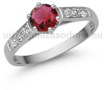 Modern, nőies fehér arany eljegyzési gyűrű 5 mm-es rubin kővel középen és 3-3 cirkónia kővel oldalt.