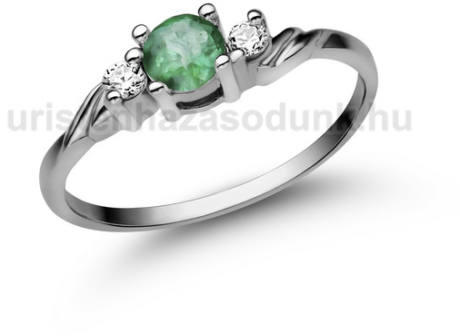 Csavart fazonú eljegyzési gyűrű smaragd kővel középen és 1-1 gyémánt kővel oldalt.