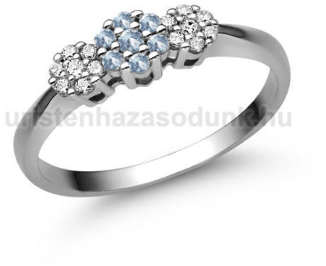 Különleges eljegyzési gyűrű akvamarin és cirkónia kövekkel, melyek 3 virág formát alkotnak.