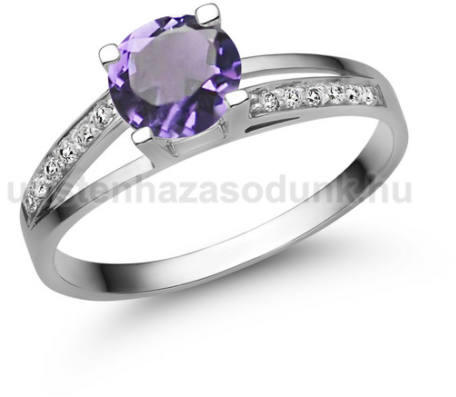 Nagy köves eljegyzési gyűrű, 6 mm-es ametiszt kővel és további 13 darab gyémánt kővel, aszimmetrikus elhelyezkedésben.