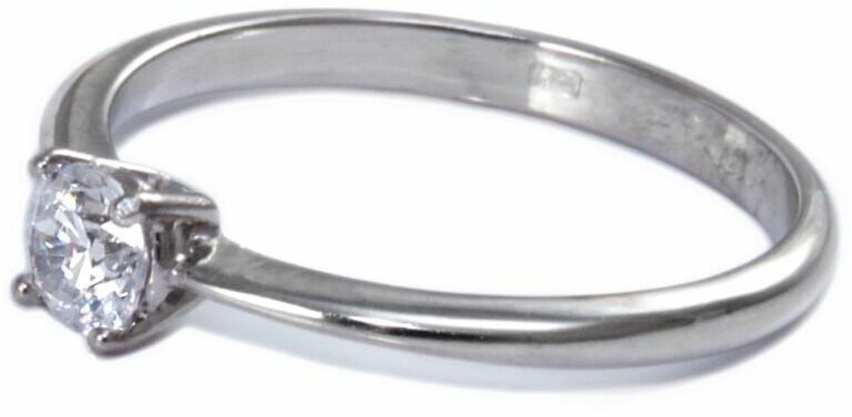 Klasszikus fazonú, fejrészén karmos foglalatban cirkónia kővel ékített, ródiummal bevont arany eljegyzési gyűrű.