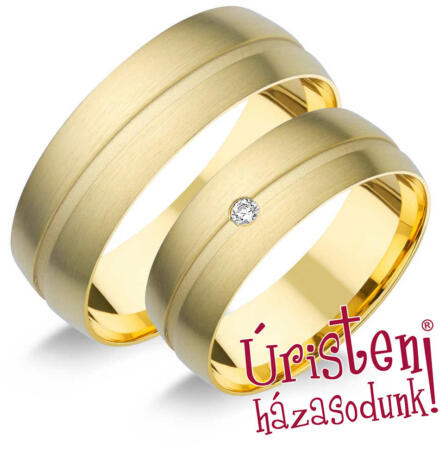 Széles, sárga arany karikagyűrű, matt felülettel, középen véséssel, enyhén domború külső-belső profillal. A női gyűrűt 1 cirkónia kő díszíti.