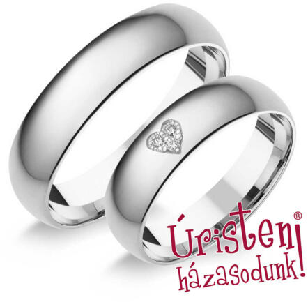 Kézzel készített, klasszikus, fehér arany karikagyűrű, domború profillal, 3 gyémánt kővel ékítve, szív alakú foglalatban.