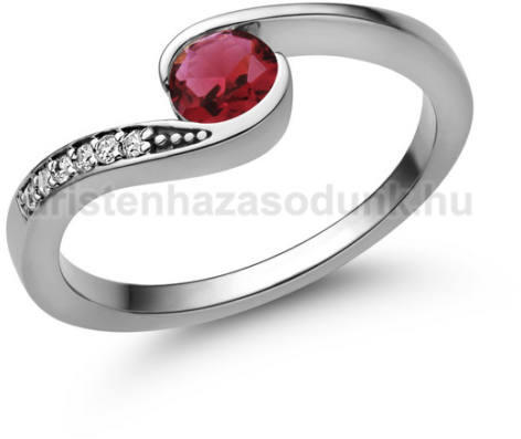 Modern, csavart stílusú fehér arany eljegyzési gyűrű rubin kővel és gyémánt kövekkel.