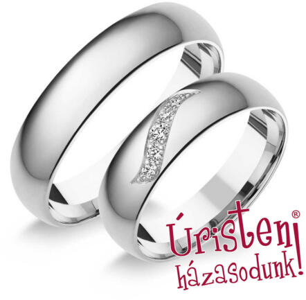 Kézzel készített, klasszikus, fehér arany karikagyűrű, domború profillal, 5 cirkónia kővel díszítve.