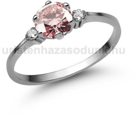 Nagy köves fehér arany eljegyzési gyűrű, 5.5 mm-es rózsaszín zafír kővel középen és 2 kisebb gyémánt kővel oldalt.