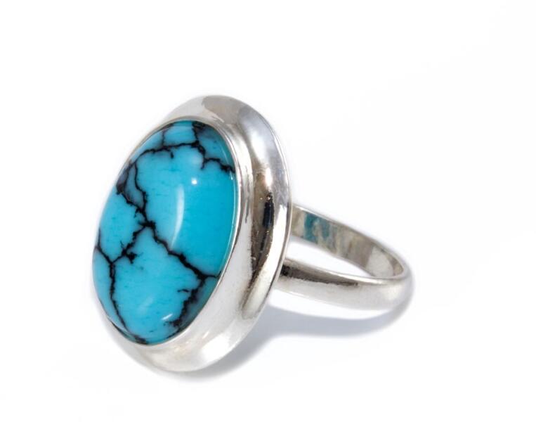 Igen mutatós, fejrészén kabosonra csiszolt festett howlit kővel díszített ezüst gyűrű.