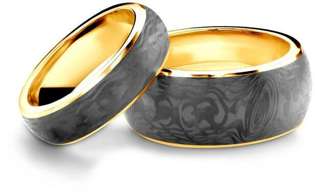 Esküvői karikagyűrűk: karbon és arany, félkör, 6 mm és 10 mm